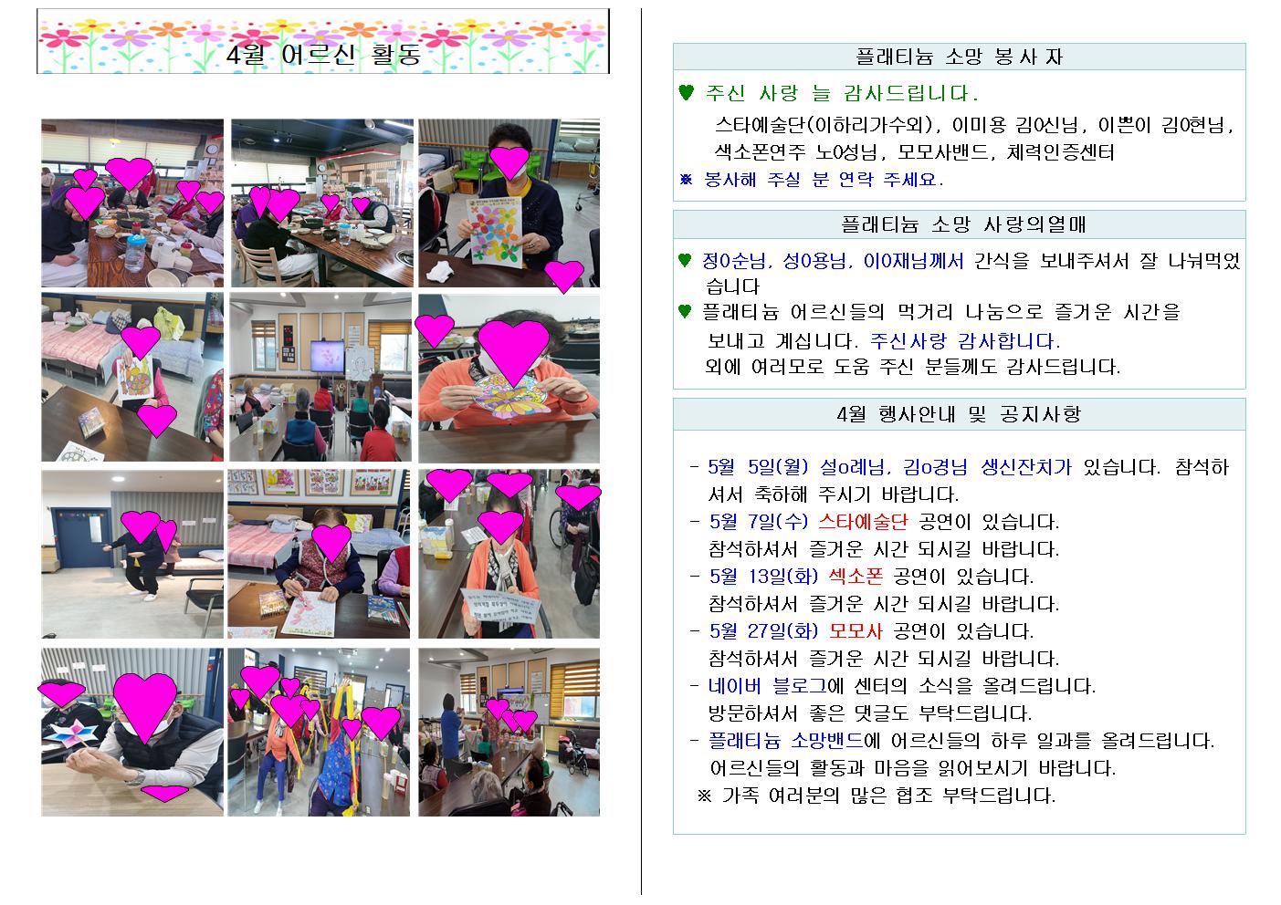플래티늄 소망 요양원 2025년 05월 소식지 관리자 2025-05-04 15:31 플래티늄 소망 요양원 2025년 05월 소식지입니다. 다음글 플래티늄 소망 주야간보호센터 2025년 5월 프로그램 일정표및 식단표 이전글 플래티늄 소망 요양원 2025년 05월 프로그램 일정표 및 식단표 목록