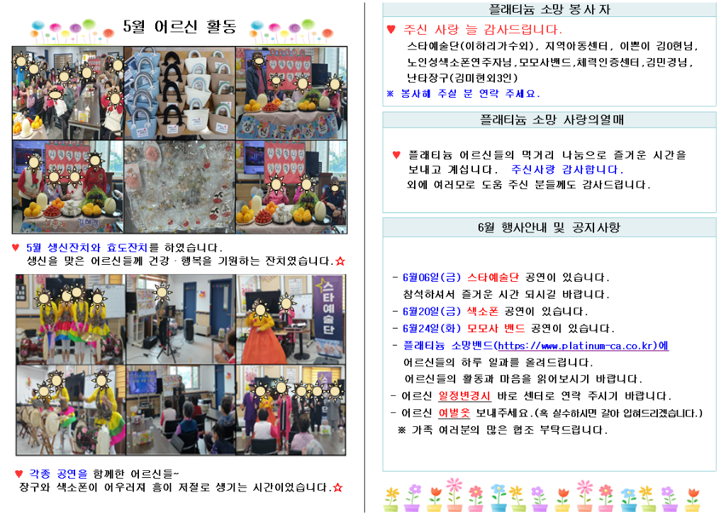 플래티늄 소망 주야간보호센터 6월 소식지 관리자 2025-06-05 13:37 다음글 플래티늄 소망 주야간보호센터 2025년 7월 프로그램 일정표및 식단표 이전글 플래티늄 소망 주야간보호센터 2025년 6월 프로그램 일정표및 식단표 목록