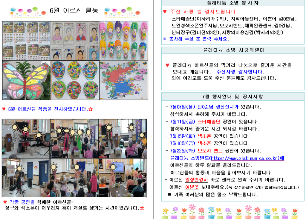 플래티늄 소망 주야간보호센터 7월 소식지 관리자 2025-07-01 16:15 다음글 플래티늄 소망 요양원 7월 프로그램 계획서 및 식단표 이전글 플래티늄 소망 주야간보호센터 2025년 7월 프로그램 일정표및 식단표 목록