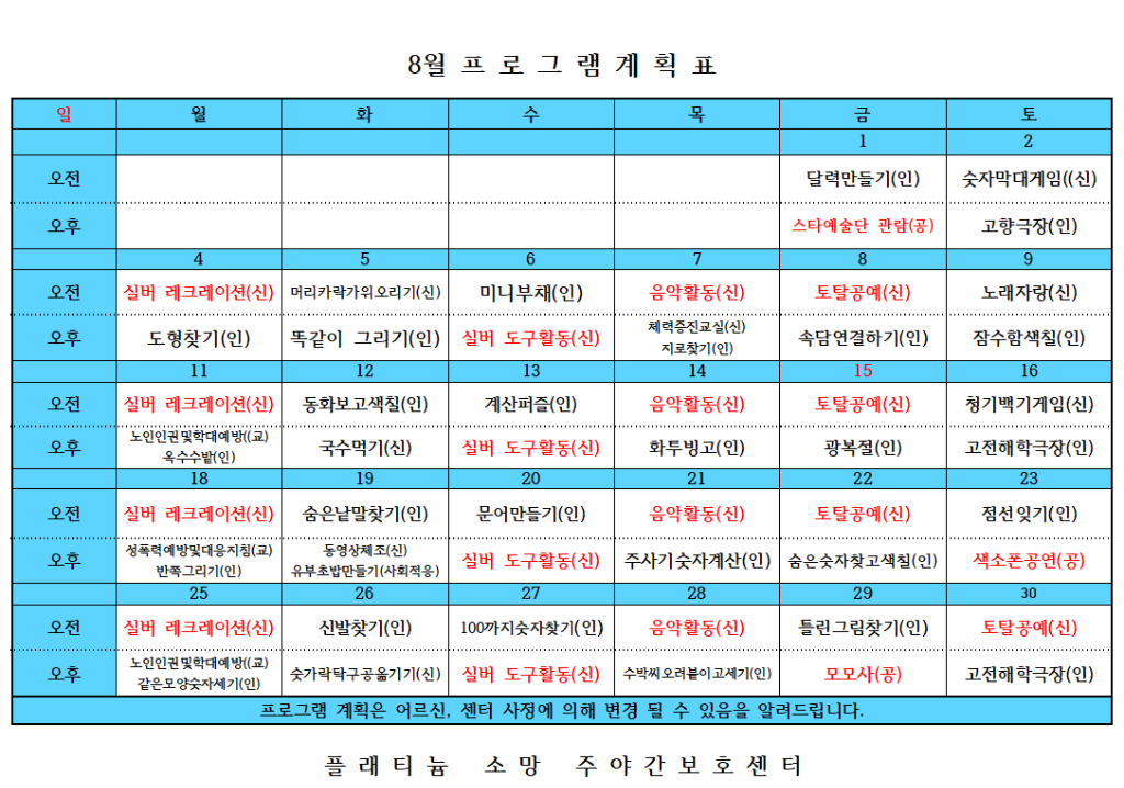 플래티늄 소망 주야간보호센터 2025년 8월 프로그램 일정표및 식단표 관리자 2025-08-02 14:01 다음글 플래티늄 소망 주야간보호센터 8월 소식지 이전글 플래티늄 소망 요양원 7월 소식지 목록