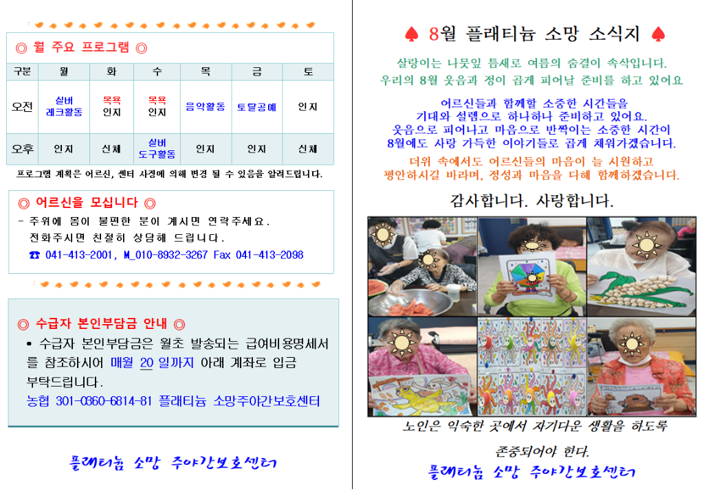 플래티늄 소망 주야간보호센터 8월 소식지 관리자 2025-08-02 14:03 다음글 플래티늄 소망 요양원 8월 프로그램 계획서 및 식단표 이전글 플래티늄 소망 주야간보호센터 2025년 8월 프로그램 일정표및 식단표 목록
