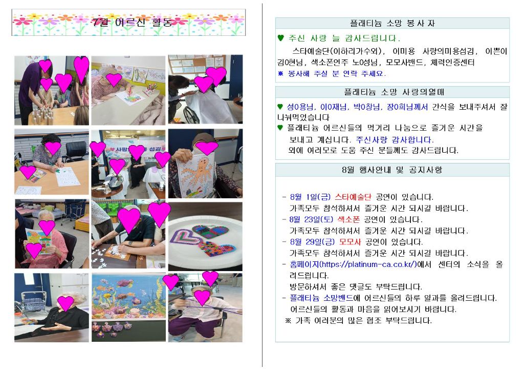 플래티늄 소망 요양원 8월 소식지 관리자 2025-08-07 23:22 플래티늄 소망 요양원 8월 소식지 입니다. 다음글 플래티늄 소망 주야간보호센터 2025년 9월 프로그램 일정표및 식단표 이전글 플래티늄 소망 요양원 8월 프로그램 계획서 및 식단표 목록