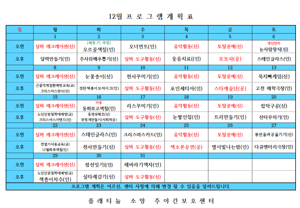 플래티늄 소망 주야간보호센터 2025년 12 프로그램 일정표및 식단표 관리자 2025-12-01 17:10 다음글 플래티늄 소망 주야간보호센터 12월 소식지 이전글 플래티늄 소망 요양원 12월 소식지 입니다. 목록