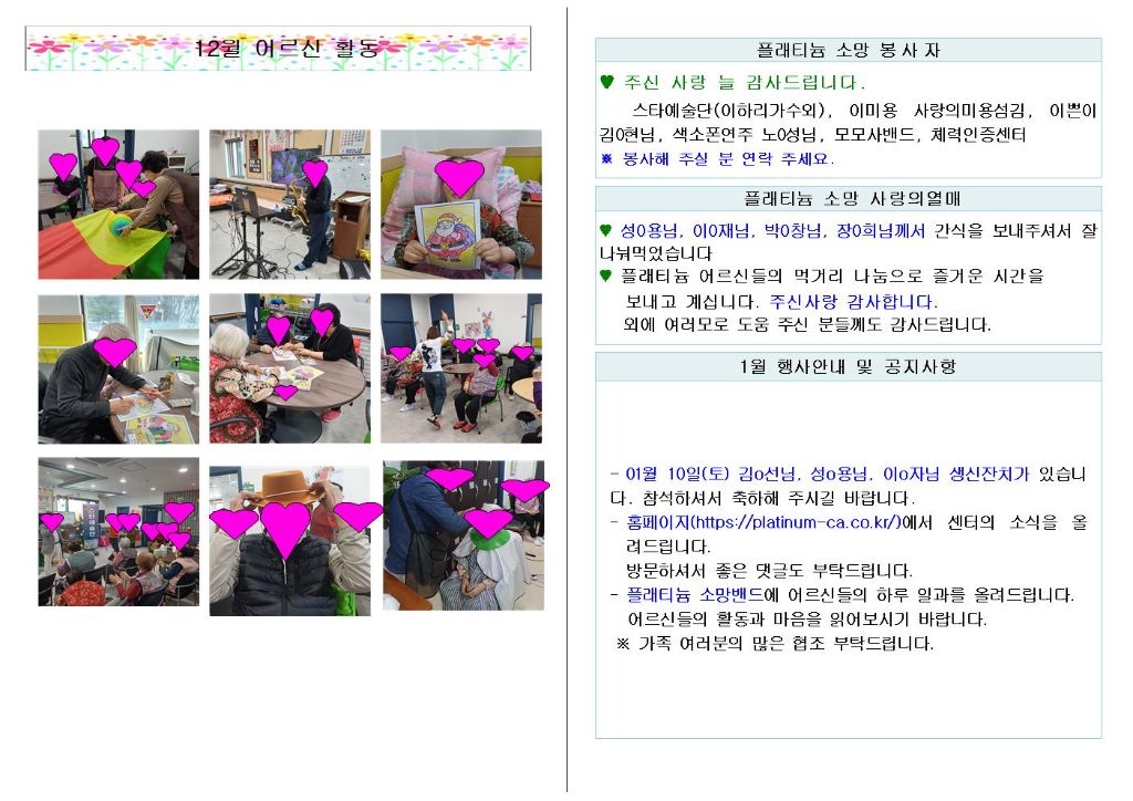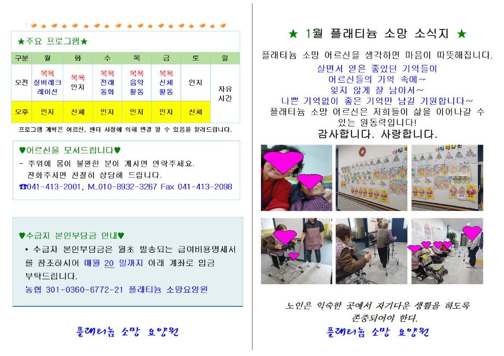 플래티늄 소망 요양원 26년 1월 소식지 관리자 2025-12-31 23:55 플래티늄 소망 요양원 26년 1월 소식지 입니다~ 다음글 플래티늄 소망 주야간보호센터 2026년 1 프로그램 일정표및 식단표 이전글 플래티늄 소망 요양원 26년 1월 프로그램 계획서 및 식단표 목록