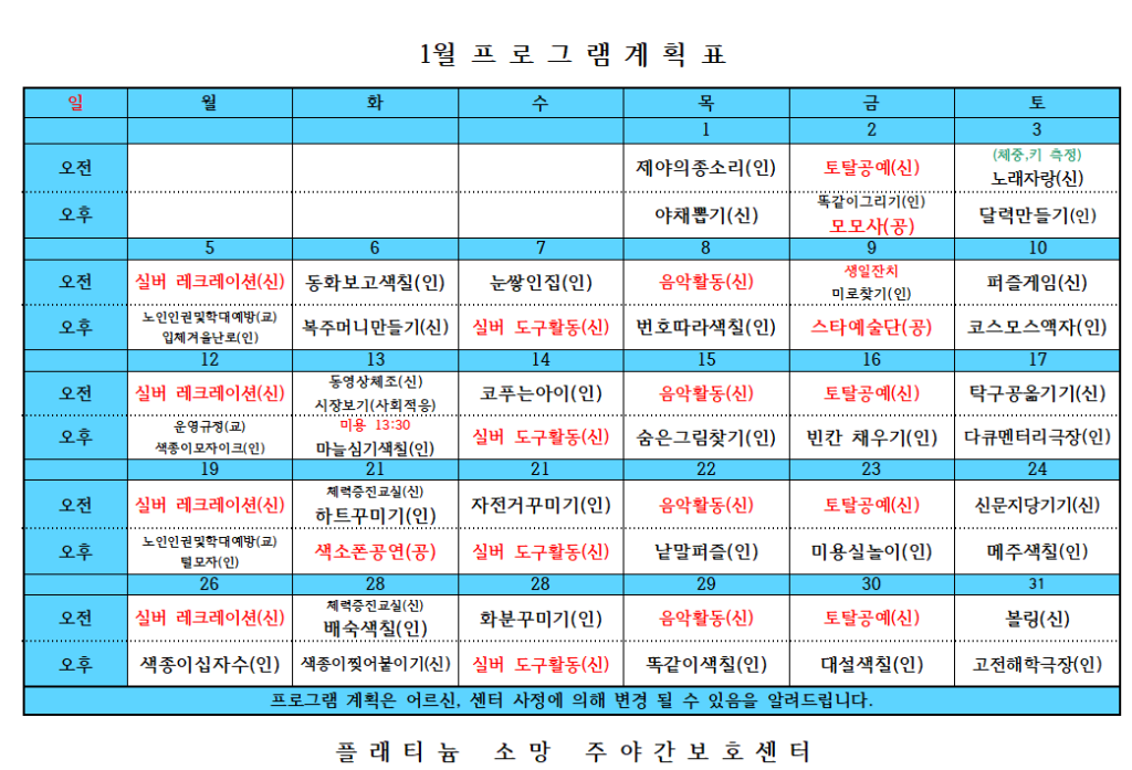 플래티늄 소망 주야간보호센터 2026년 1 프로그램 일정표및 식단표 관리자 2026-01-01 14:01 다음글 플래티늄 소망 주야간보호센터 2026년 1월 소식지 이전글 플래티늄 소망 요양원 26년 1월 소식지 목록