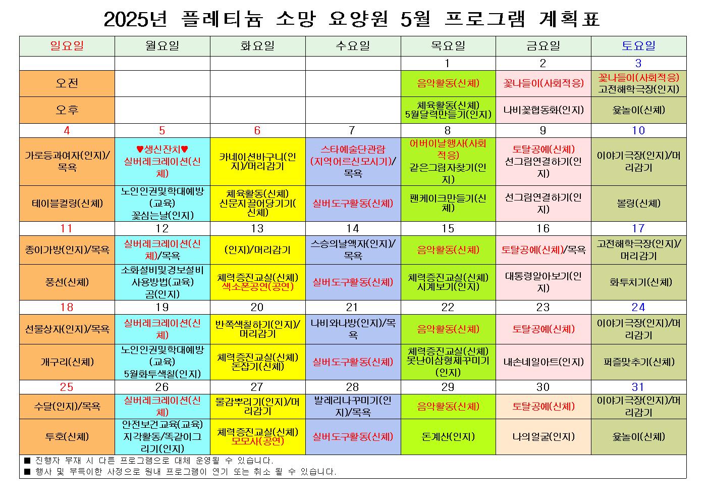 플래티늄 소망 요양원 2025년 05월 프로그램 일정표 및 식단표 관리자 2025-05-04 15:30 플래티늄 소망 요양원 2025년 5월 프로그램 일정표 및 식단표 입니다. 다음글 플래티늄 소망 요양원 2025년 05월 소식지 이전글 플래티늄 소망 요양원 2025년 04월 소식지 목록