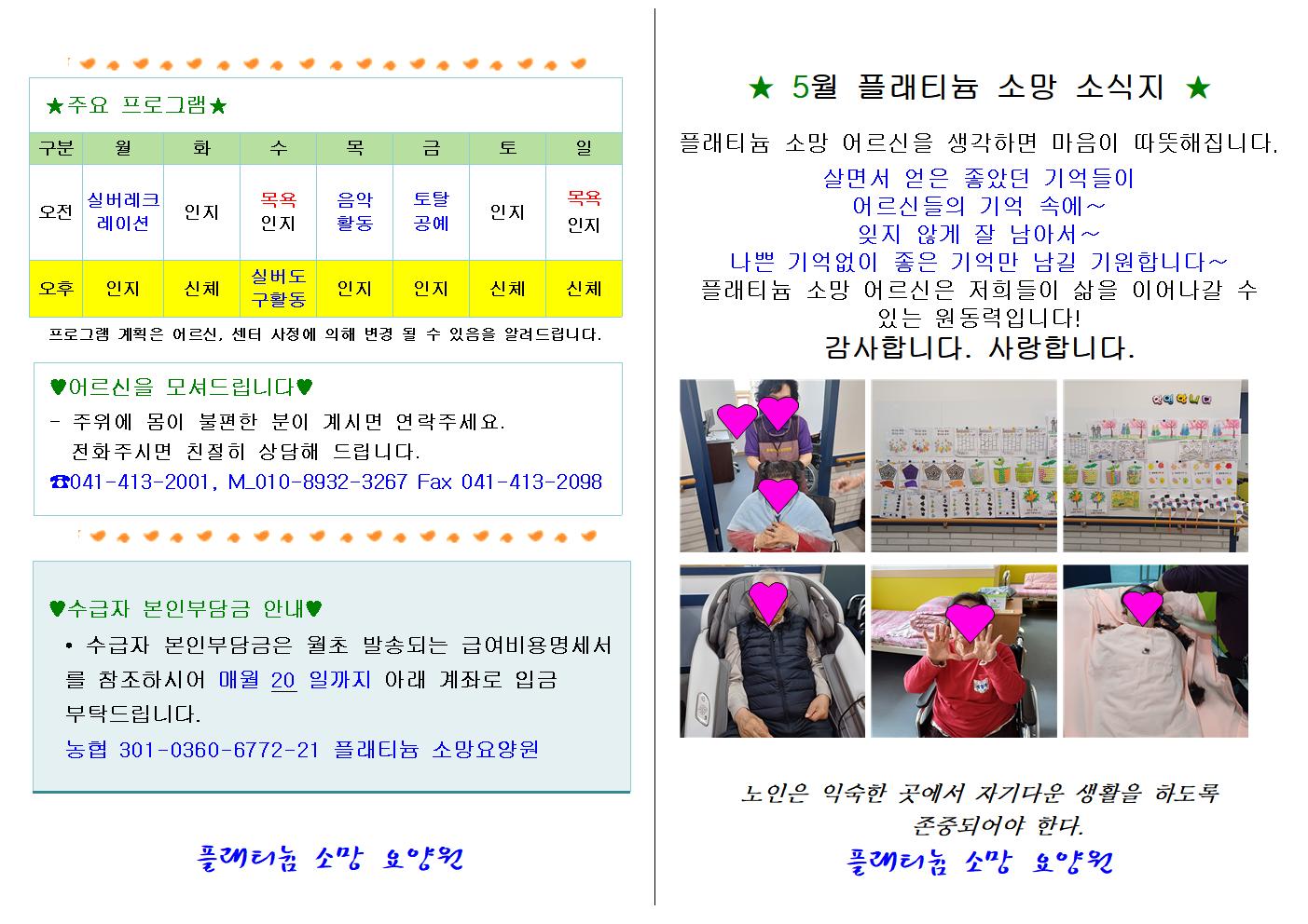플래티늄 소망 요양원 2025년 05월 소식지 관리자 2025-05-04 15:31 플래티늄 소망 요양원 2025년 05월 소식지입니다. 다음글 플래티늄 소망 주야간보호센터 2025년 5월 프로그램 일정표및 식단표 이전글 플래티늄 소망 요양원 2025년 05월 프로그램 일정표 및 식단표 목록