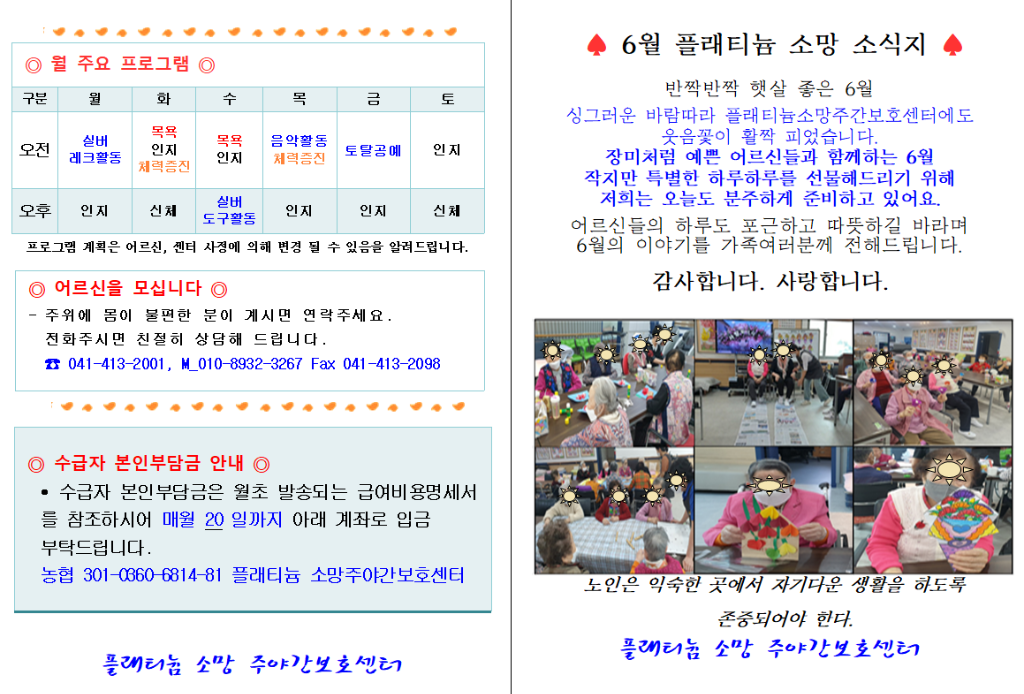플래티늄 소망 주야간보호센터 6월 소식지 관리자 2025-06-05 13:37 다음글 플래티늄 소망 주야간보호센터 2025년 7월 프로그램 일정표및 식단표 이전글 플래티늄 소망 주야간보호센터 2025년 6월 프로그램 일정표및 식단표 목록