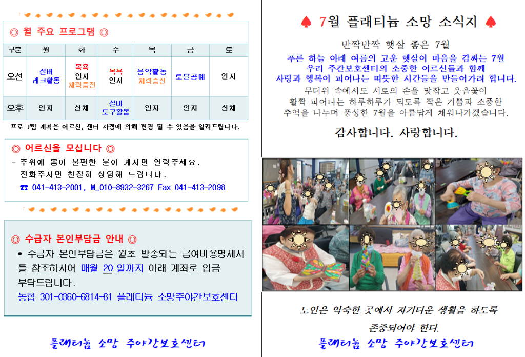 플래티늄 소망 주야간보호센터 7월 소식지 관리자 2025-07-01 16:15 다음글 플래티늄 소망 요양원 7월 프로그램 계획서 및 식단표 이전글 플래티늄 소망 주야간보호센터 2025년 7월 프로그램 일정표및 식단표 목록