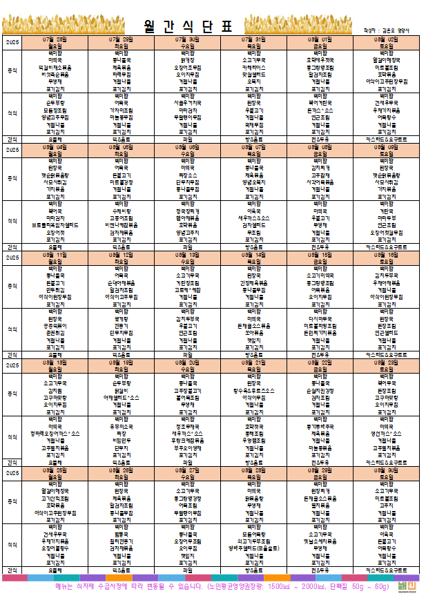 플래티늄 소망 주야간보호센터 2025년 8월 프로그램 일정표및 식단표 관리자 2025-08-02 14:01 다음글 플래티늄 소망 주야간보호센터 8월 소식지 이전글 플래티늄 소망 요양원 7월 소식지 목록