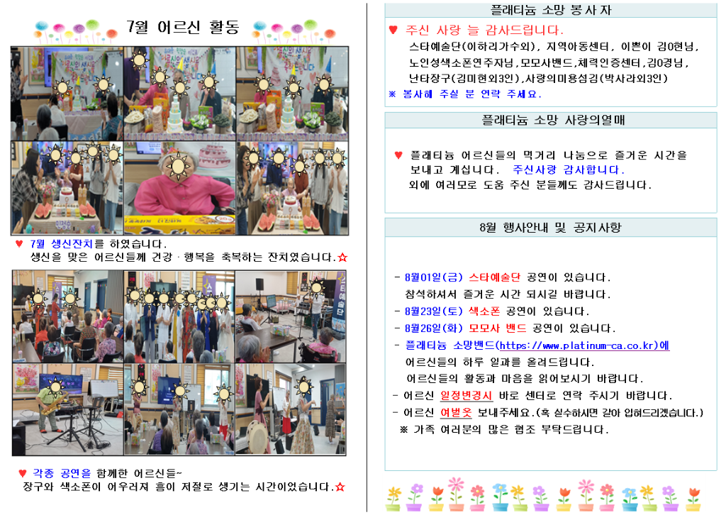 플래티늄 소망 주야간보호센터 8월 소식지 관리자 2025-08-02 14:03 다음글 플래티늄 소망 요양원 8월 프로그램 계획서 및 식단표 이전글 플래티늄 소망 주야간보호센터 2025년 8월 프로그램 일정표및 식단표 목록