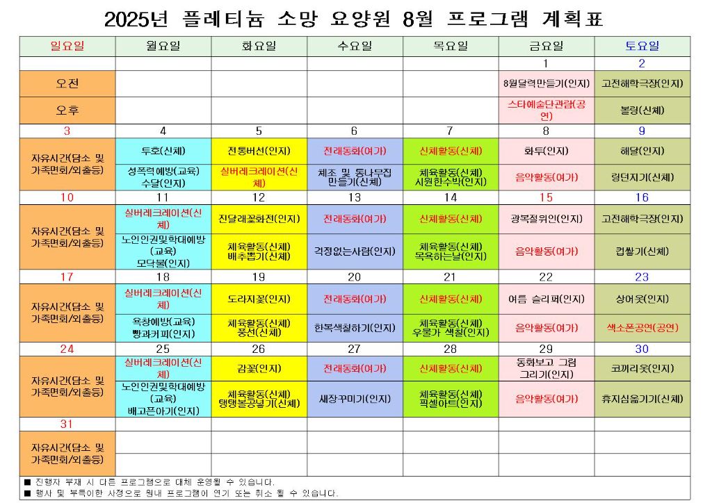 플래티늄 소망 요양원 8월 프로그램 계획서 및 식단표 관리자 2025-08-07 23:19 플래티늄 소망 요양원 8월 프로그램 계획서 및 식단표 입니다. 다음글 플래티늄 소망 요양원 8월 소식지 이전글 플래티늄 소망 주야간보호센터 8월 소식지 목록