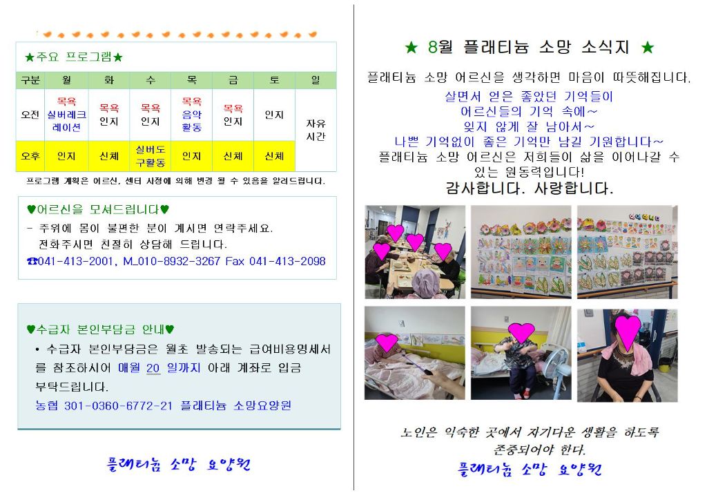 플래티늄 소망 요양원 8월 소식지 관리자 2025-08-07 23:22 플래티늄 소망 요양원 8월 소식지 입니다. 다음글 플래티늄 소망 주야간보호센터 2025년 9월 프로그램 일정표및 식단표 이전글 플래티늄 소망 요양원 8월 프로그램 계획서 및 식단표 목록