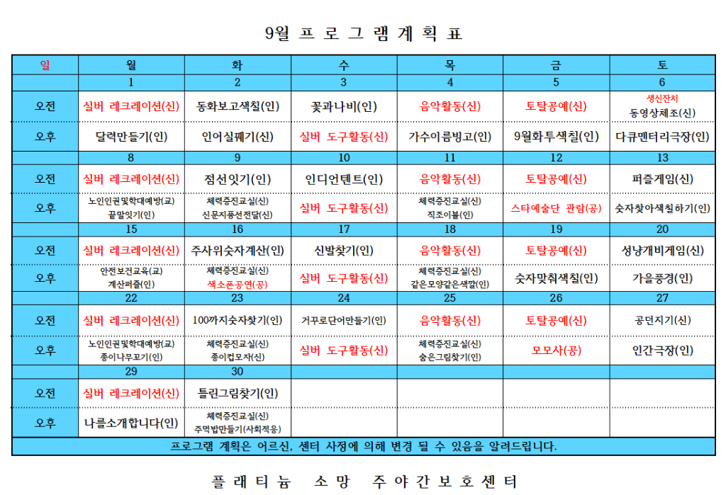 플래티늄 소망 주야간보호센터 2025년 9월 프로그램 일정표및 식단표 관리자 2025-09-03 17:11 다음글 플래티늄 소망 주야간보호센터 9월 소식지 이전글 플래티늄 소망 요양원 8월 소식지 목록