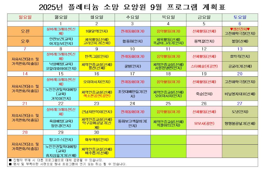 플래티늄 소망 요양원 9월 프로그램 계획서 및 식단표 관리자 2025-09-03 17:33 플래티늄 소망 요양원 9월 프로그램 계획서 및 식단표 입니다. 다음글 플래티늄 소망 요양원 9월 소식지 이전글 플래티늄 소망 주야간보호센터 9월 소식지 목록