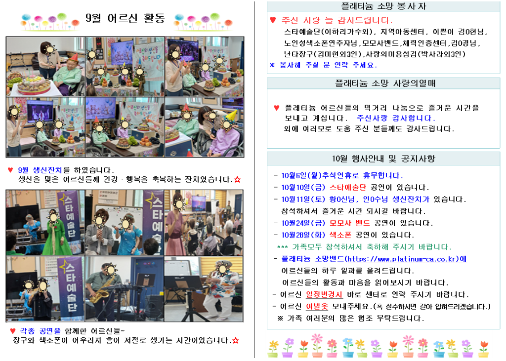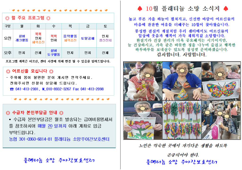 플래티늄 소망 주야간보호센터 10월 소식지 관리자 2025-10-01 16:10 다음글 플래티늄 소망 요양원 11월 프로그램 계획서 및 식단표 이전글 플래티늄 소망 주야간보호센터 2025년 10월 프로그램 일정표및 식단표 목록