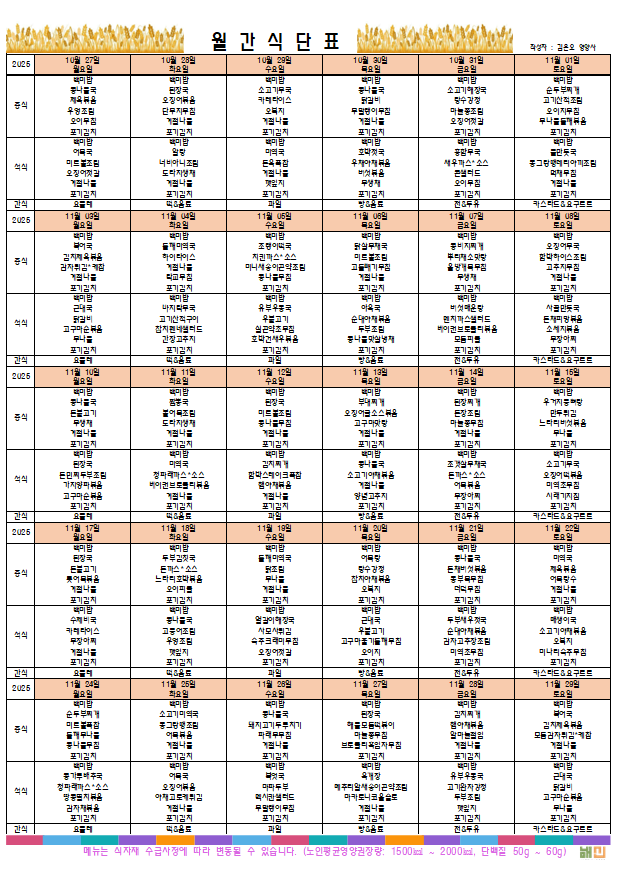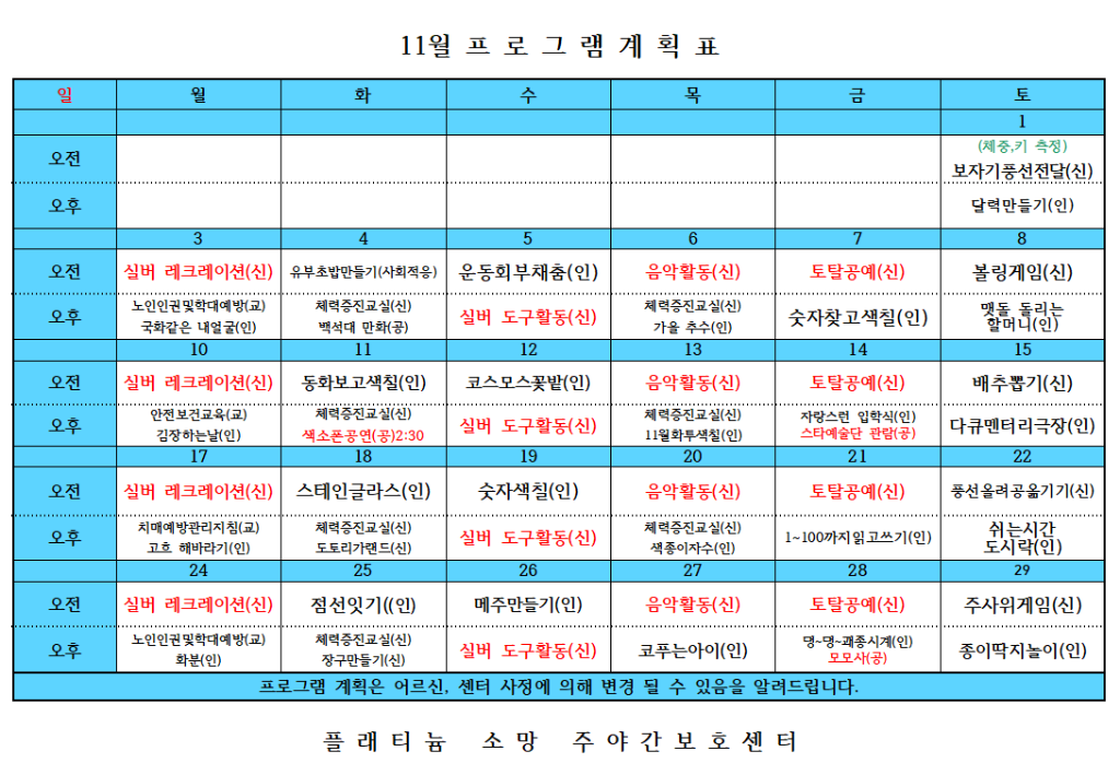 플래티늄 소망 주야간보호센터 2025년 11 프로그램 일정표및 식단표 관리자 2025-11-03 09:37 다음글 플래티늄 소망 주야간보호센터 11월 소식지 이전글 플래티늄 소망 요양원 11월 소식지 목록