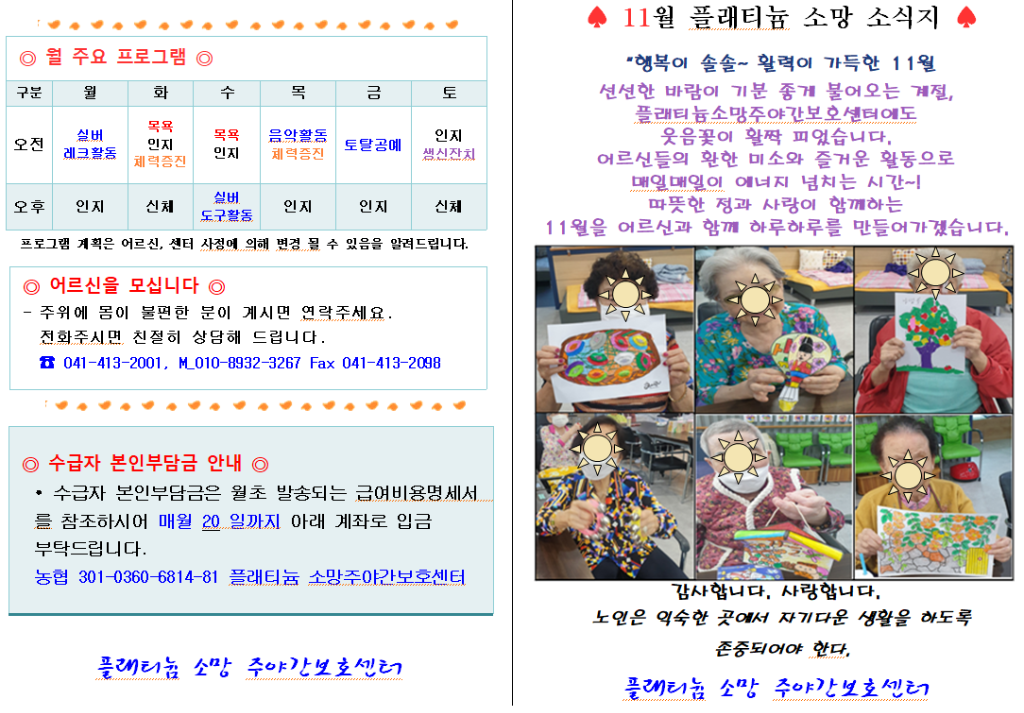 플래티늄 소망 주야간보호센터 11월 소식지 관리자 2025-11-03 09:38 다음글 플래티늄 소망 요양원 12월 프로그램 계획서 및 식단표 이전글 플래티늄 소망 주야간보호센터 2025년 11 프로그램 일정표및 식단표 목록