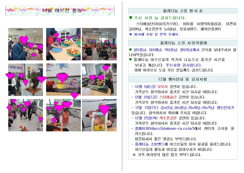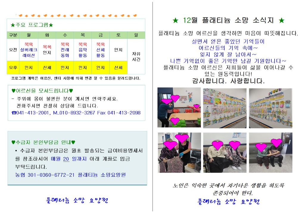 플래티늄 소망 요양원 12월 소식지 입니다. 관리자 2025-11-29 17:55 플래티늄 소망 요양원 12월 소식지 입니다. 다음글 플래티늄 소망 주야간보호센터 2025년 12 프로그램 일정표및 식단표 이전글 플래티늄 소망 요양원 12월 프로그램 계획서 및 식단표 목록