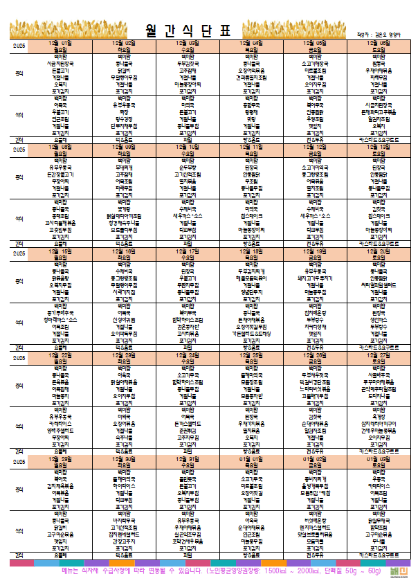 플래티늄 소망 주야간보호센터 2025년 12 프로그램 일정표및 식단표 관리자 2025-12-01 17:10 다음글 플래티늄 소망 주야간보호센터 12월 소식지 이전글 플래티늄 소망 요양원 12월 소식지 입니다. 목록
