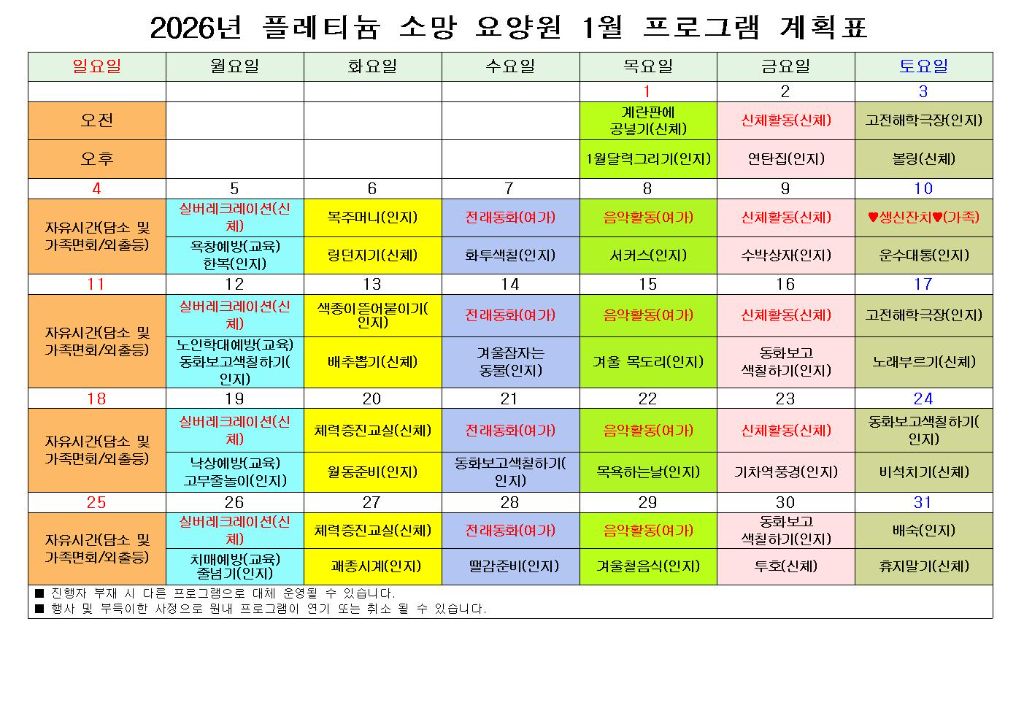 플래티늄 소망 요양원 26년 1월 프로그램 계획서 및 식단표 관리자 2025-12-31 23:51 플래티늄 소망 요양원 26년 1월 프로그램 계획서 및 식단표입니다. 다음글 플래티늄 소망 요양원 26년 1월 소식지 이전글 플래티늄 소망 주야간보호센터 12월 소식지 목록
