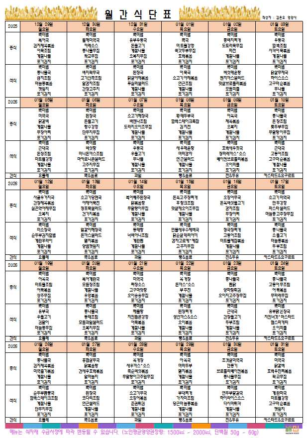 플래티늄 소망 주야간보호센터 2026년 1 프로그램 일정표및 식단표 관리자 2026-01-01 14:01 다음글 플래티늄 소망 주야간보호센터 2026년 1월 소식지 이전글 플래티늄 소망 요양원 26년 1월 소식지 목록