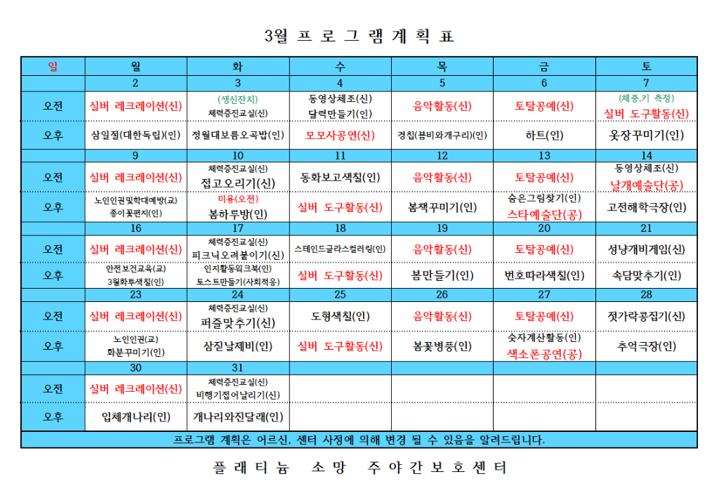 플래티늄 소망 주야간보호센터 2026년 3 프로그램 일정표및 식단표 관리자 2026-03-02 15:58 다음글 플래티늄 소망 주야간보호센터 2026년 3월 소식지 이전글 플래티늄 소망 요양원 26년 3월 프로그램 계획서 및 식단표 목록